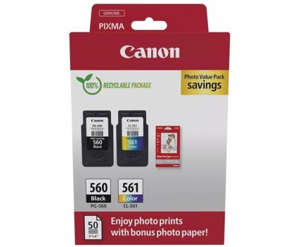 2 Tinteiros Originais, Canon PG-560 / CL-561 Preto 7.5ml + Cor 8.3ml + 50 Folhas 10x15cm